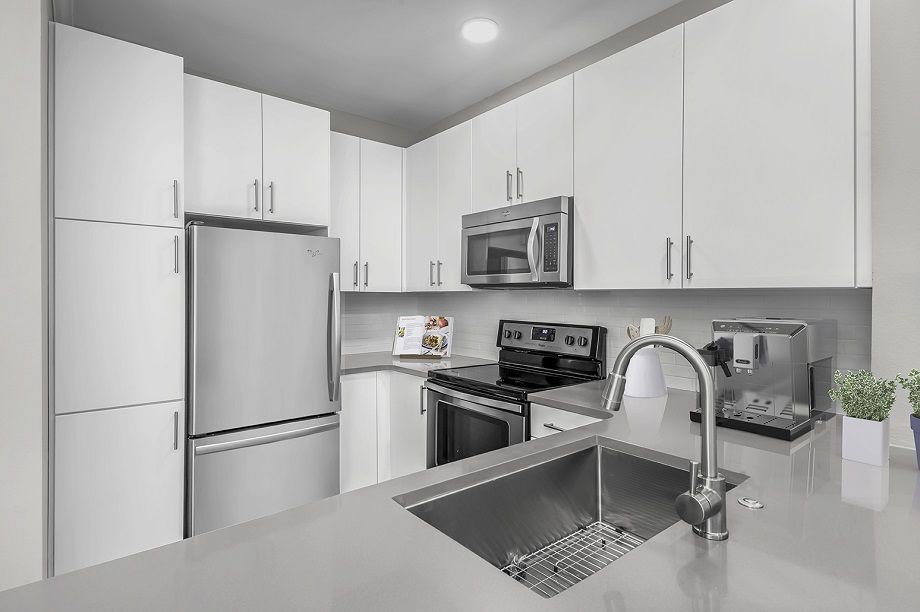 Our newly remodeled studio one and two bedroom apartments have white cabinetry gray Caesarstone quartz countertops and Arctic White subway tile backsplash in the kitchen with large rainfall shower heads Lyric Pro Thermostats LED lighting more.
